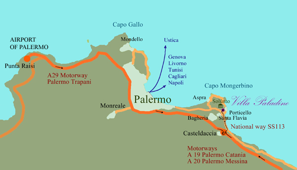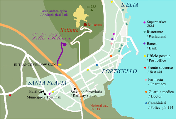 ARRIVO AUTOSTRADE: uscita Casteldaccia per Strada Statale 113 sino a superare di m. 100 l'incrocio ingresso di Santa Flavia. Un cartello giallo indica la stradella di accesso alla Villa. Se uscite dall'autostrada allo svincolo di Altavilla Milicia sulla Strada Statale 113 potrete percorrere un tratto di territorio di alto valore paesaggistico, scorgendo da lontano i resti dell'antica Solùnto.