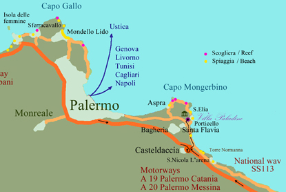 ARRIVO AEROPORTI PALERMO O CATANIA: autobus o metro sino alla Stazione Centrale di Palermo, quindi treno per Santa Flavia (viaggio 12 min.). Qui superate il passaggio a livello ferroviario e andate a sinistra sulla via nazionale 113 per m. 100.